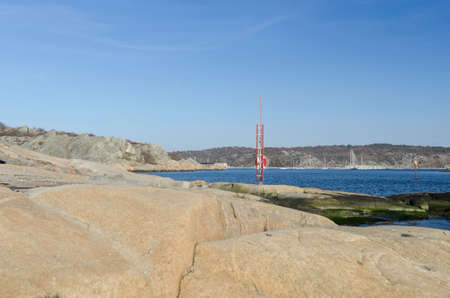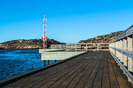 Bright red life ring and ladder on a wooden pontoon on swedish shore rocky coastline