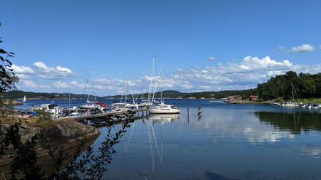 Scenic panorama of a waterfront with boats, yachts and houses in Kungshamn (Sotenäs, Västra Götaland, Sweden) on a sunny day in summer