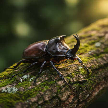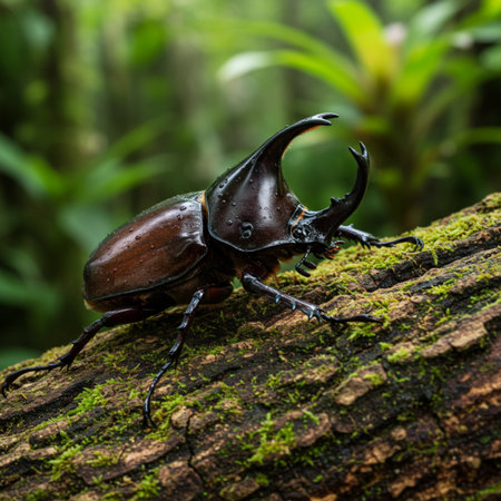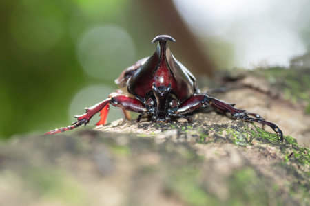 A photograph of an angry rhinoceros beetle, side view, crawling on a tree branch, macro photography, nature background, green bokeh, macro lens, macro shot, macro detail, macro photography. --ar 3:2 --v 6.1 Job ID: fadc3850-f46b-48c9-bc00-32fc343d076b