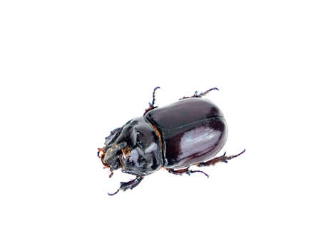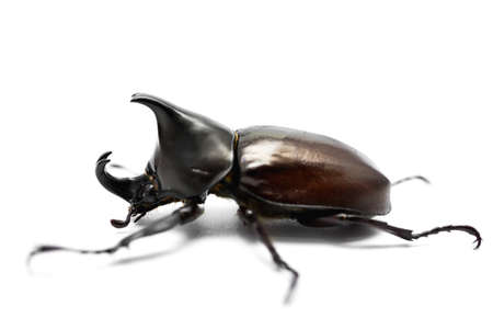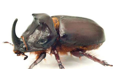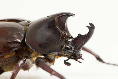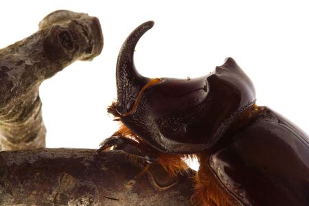 Side Macro view of rhinoceros or unicorn beetle over white background