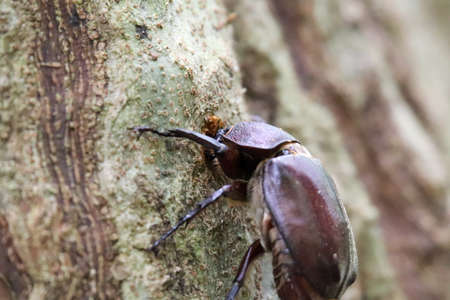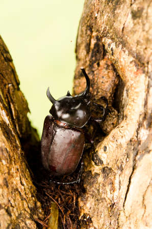 Close up male fighting beetle (rhinoceros beetle) on tree