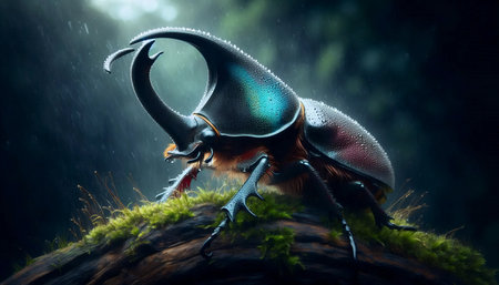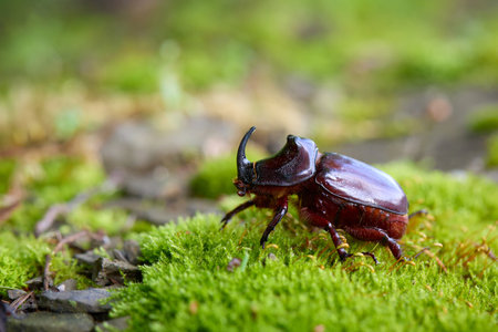 Rhinoceros beetle male walking on fresh forest moss early morning