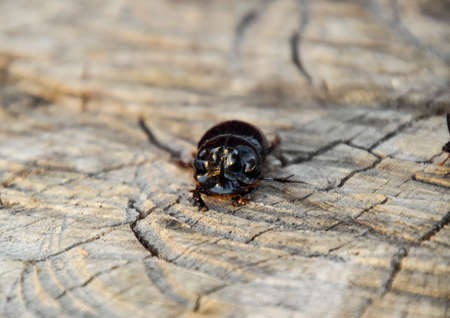 A rhinoceros beetle on a cut of a tree stump. A pair of rhinoceros beetles.