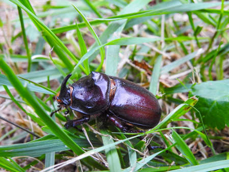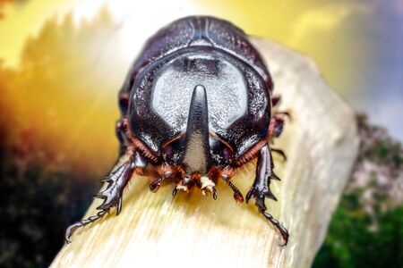 Big brown the rhinoceros beetle (Oryctes nasicornis) close-up. This exceptional insect, a symbol of strength and resilience