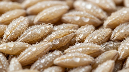 A detailed macro photograph showcasing a pile of barley grains covered in small, glistening water droplets, highlighting their texture.