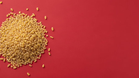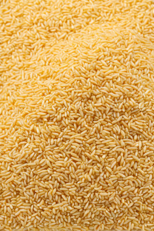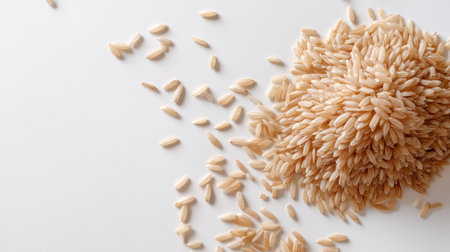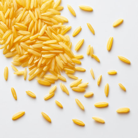 A vibrant close-up image of raw golden rice grains scattered on a pristine white background. Perfect for culinary projects, cooking guides, or healthy diet illustrations.