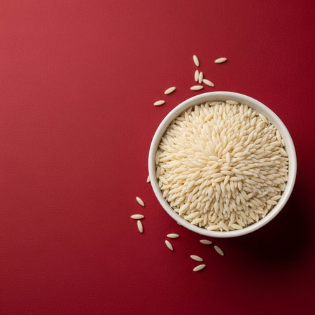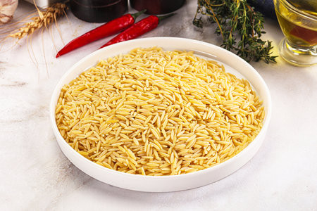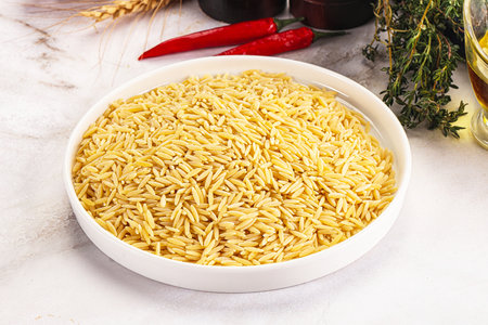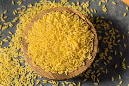 Organic Dried Orzo Pasta in a Bowl, top view.