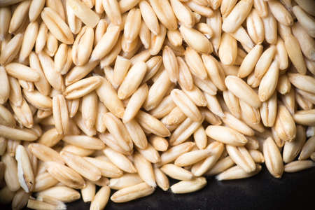 Pile of unpeeled oat grains on wooden background, top view, close-up, macro, selective focus, shallow depth of field. Some copy space. Dietary food. Healthy eating, dieting. Natural nutritious oatmeal. Vegan cuisine. Organic food concept.