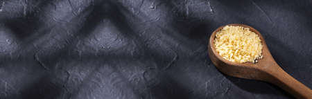 Italian orzo pasta in a wooden spoon & forming a background. Suitable for vegan & vegetarian diet, gluten free & high in fibre, vitamins & minerals. Flat lay, top view.