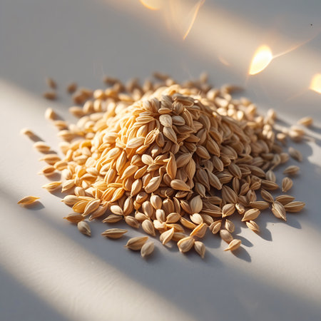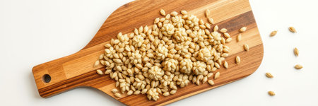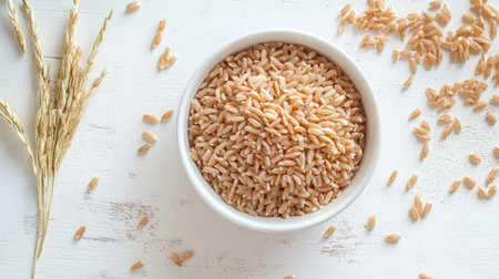Discover the beauty of organic farro grain, elegantly displayed on a light background. Perfect for culinary uses and highlighting healthy ingredients.