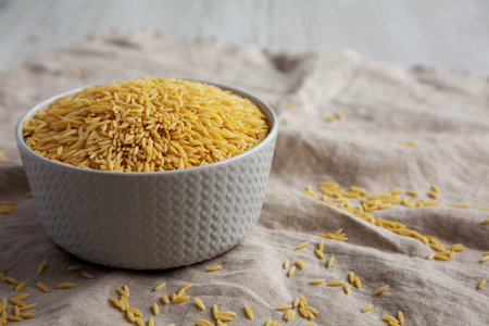 Organic Dried Orzo Pasta in a Bowl, side view. Copy space.
