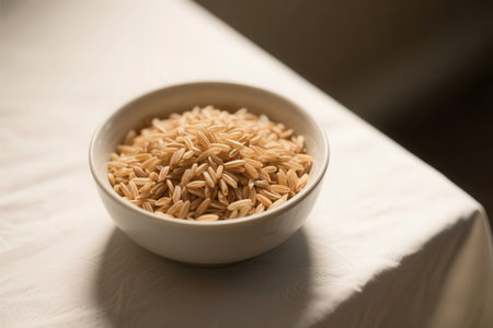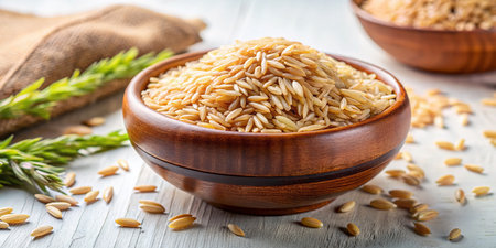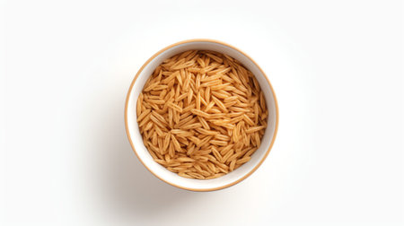 Close-up of Raw Brown Rice in Bowl, White Background - Organic Food Photography