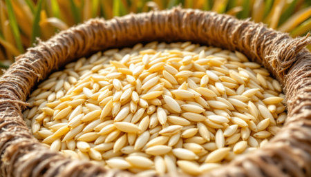 A premium rice grain closeup in rustic woven basket with natural background, fresh and healthy food concept