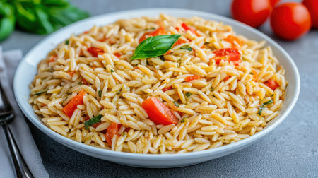 A vibrant bowl of fresh orzo pasta salad, featuring ripe tomatoes, aromatic basil, and a drizzle of olive oil, perfect for healthy dining experiences.