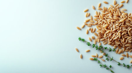 A close-up of organic farro grains scattered alongside fresh thyme. Perfect for culinary use, this image emphasizes healthy eating and natural ingredients.
