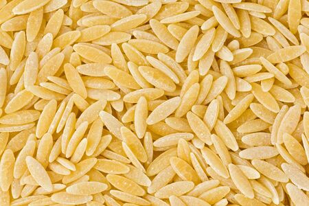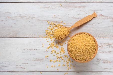 Raw orzo (risoni) pasta in wooden bowl. Close up.