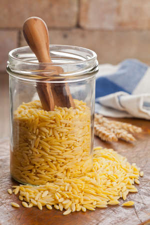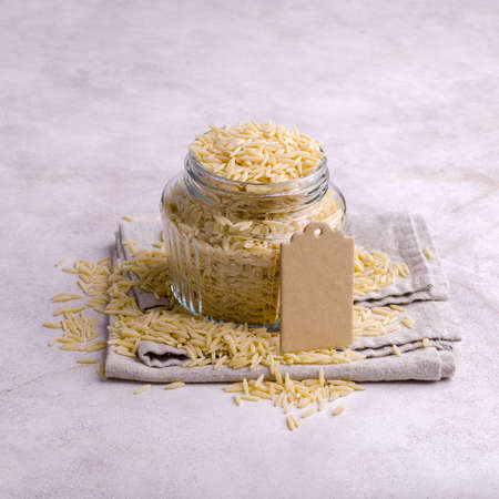 Dry risoni pasta in a glass jar on a light background. selective focus.
