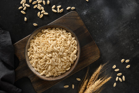 raw pearl barley in a wooden plate and a wooden spoon next to it, spilling on a dark wooden table