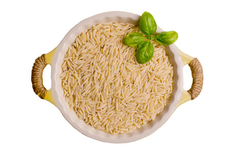 Dry orzo pasta in a ceramic dish on a white background. Top view