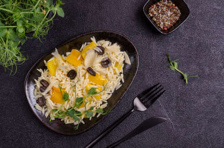 Small pasta with vegetables and pea sprouts in a plate on a cement background. Top view. Selective focus.