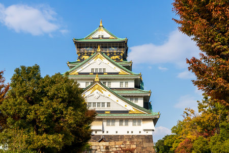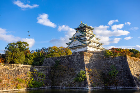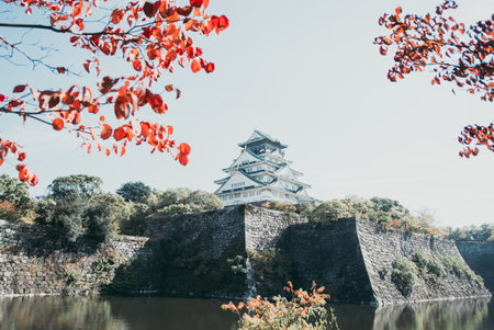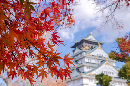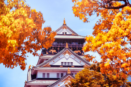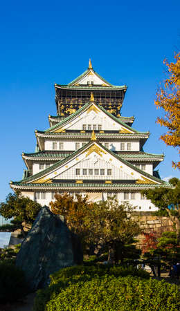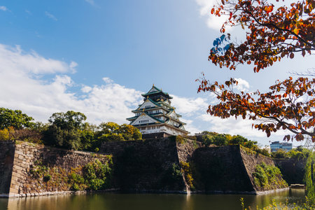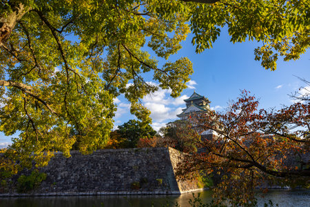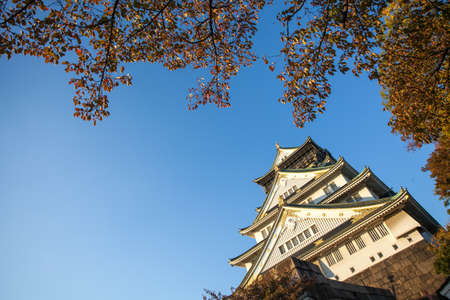 Osaka Castle is one of the greatest castles in Japan and the most famous landmark in Osaka City. Beautiful in autumn leaves with blue sky on background.