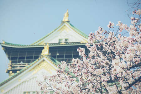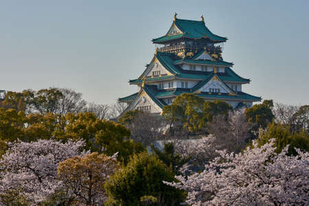 Beautiful Osaka castle with blooming cherry blossoms in Sakura spring season in Osaka, Japan