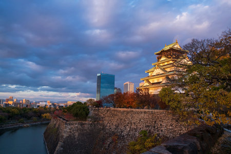 Osaka castle with city skyline and autumn foliage color at dusk, Kansai, Japan. Famous travel destination for sightseeing Kansai in fall season.