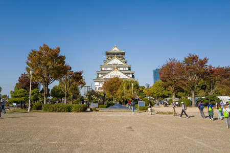 Osaka, Japan - November 7, 2023: People are seen walking and gathering in an open plaza with autumn trees, with the main tower of Osaka Castle visible in the background under a clear blue sky.