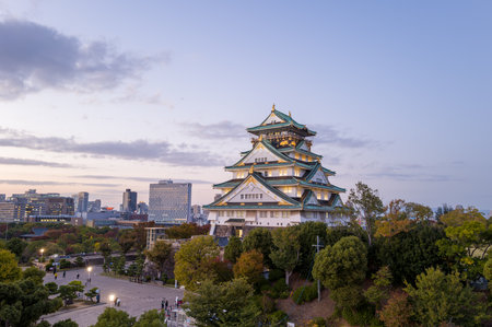 Osaka, Japan - November 7, 2023: The main tower of Osaka Castle is illuminated at dusk, with modern city buildings and trees visible in the background under a partly cloudy sky.