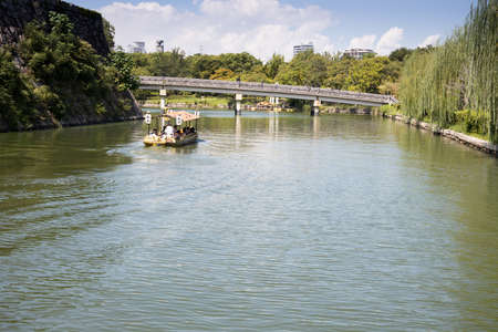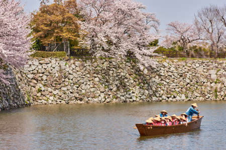 Himeji / Japan - March 31, 2018: People in a tourist boat in Himeji castle water moat admiring the blooming cherry blossom trees during the Sakura season in Himeji, Japan