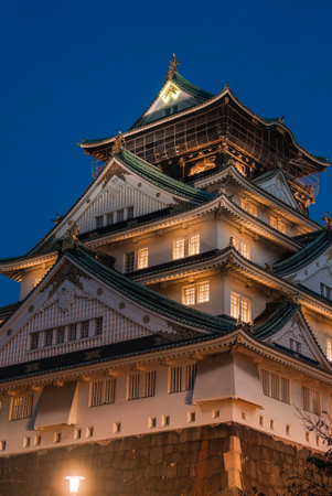 Osaka, Japan - November 7, 2023: The main tower of Osaka Castle is illuminated in the evening, with surrounding trees and modern city buildings visible in the background under a partly cloudy sky.