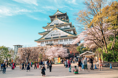 Osaka, Japan - April 5, 2016 : Osaka castle and tourist people with cherry blossoms of spring