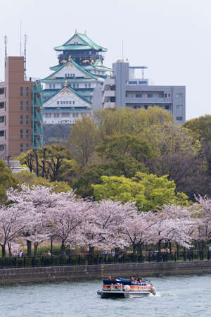 Japan Osaka castle with cherry blossom. Japanese spring view.
