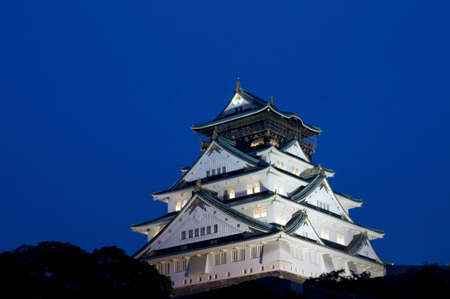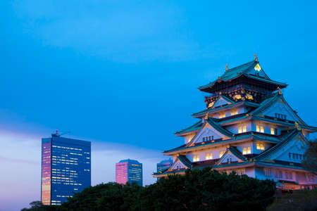 Osaka Castle or Himeji Castle at the dark blue night in Autumn season with colorful maple leaves - Osaka city, Japan.