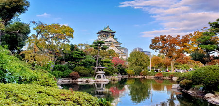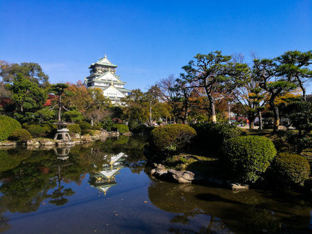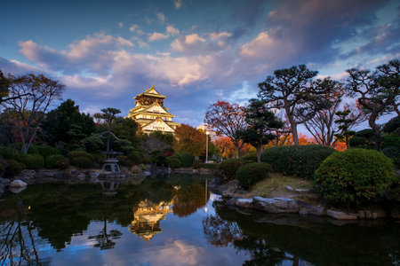 Osaka Castle view from garden with skyline reflection on pond at dusk, Kansai, Japan. Famous travel destination for sightseeing Kansai in fall season.
