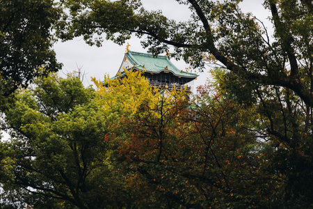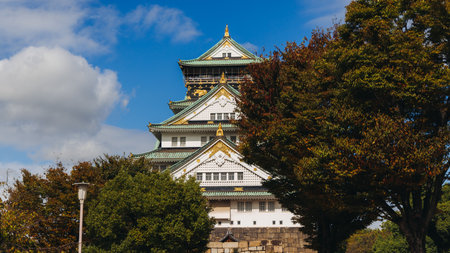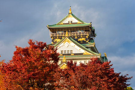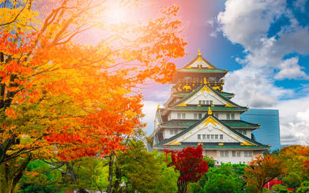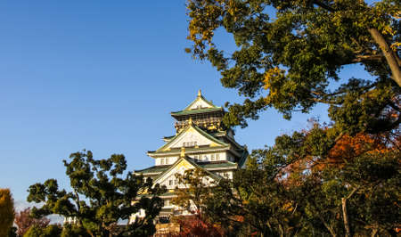 Osaka Castle building with colorful maple leaves or fall foliage in autumn season. Colorful trees, Kyoto City, Kansai, Japan. Architecture landscape background. Famous tourist attraction.