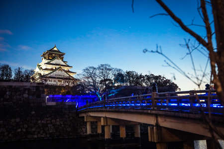 Main tower of Osaka Japanese Castle and Gokurakubashi Bridge with moat at nightfall. The old heritage buildings and most famous landmarks in Osaka, Japan, Asia.