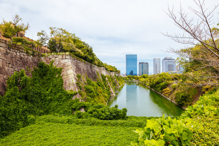 East Outer moat of Osaka castle with skyscrapers in autumn, Osaka, Japan