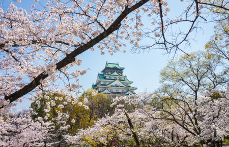 Cherry blossoms in full bloom frame Osaka Castle, a 16th century masterpiece of Japanese architecture. The castles green roof and stone walls stand in contrast to the delicate pink and white flowers