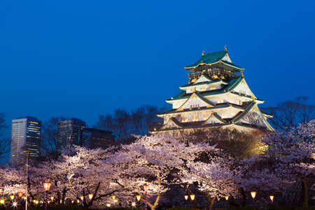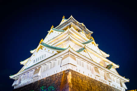 Osaka Castle or Himeji Castle at the dark blue night in Autumn season - Osaka city, Japan.