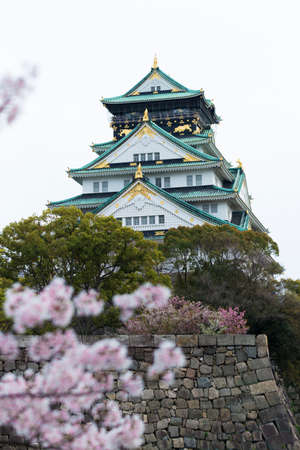 Beautiful Osaka castle with blooming cherry blossoms in Sakura spring season in Osaka, Japan
