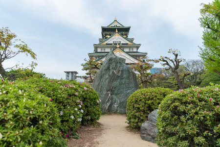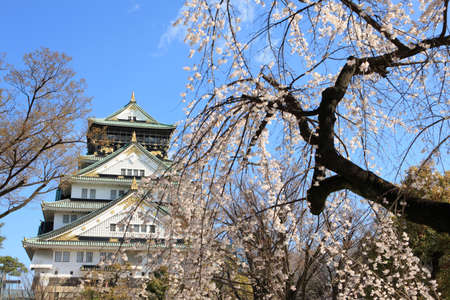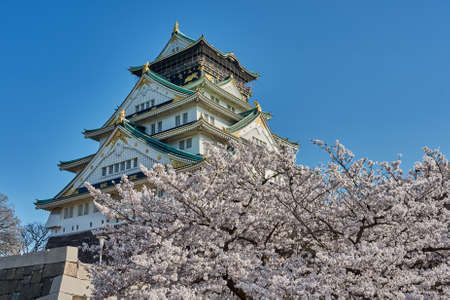 Main tower of Osaka Japanese Castle view from cherry blossom Nishinomaru Garden. The old heritage building and most famous landmark in Osaka, Japan, Asia.