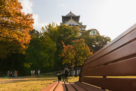 Osaka, Japan - November 7, 2023: People are seen walking and gathering in an open plaza with autumn trees, with the main tower of Osaka Castle visible in the background under a clear blue sky.