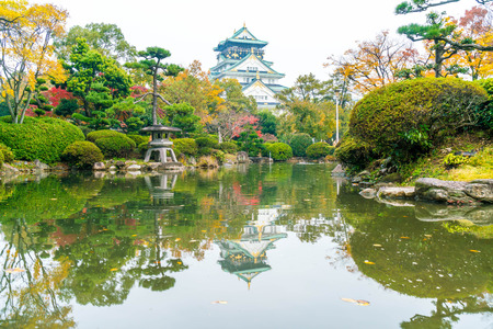 Osaka Castle at autumn with Reflection on the pond in Osaka, Japan