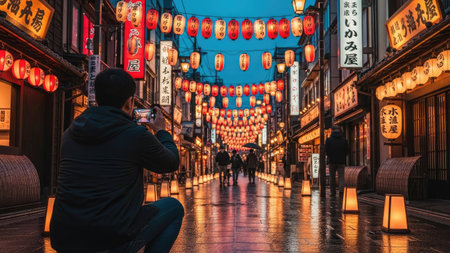 Unidentified Japanese man taking a photo of traditional red lanterns in the street of Asakusa, Tokyo, Japan.