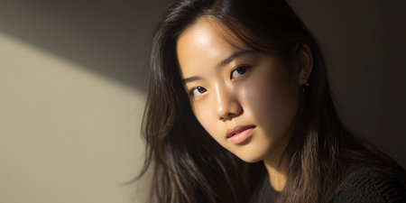 A young woman with dark hair is illuminated by natural light, casting a shadow across her face.