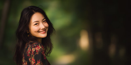 A young Asian woman with long dark hair smiles at the camera while wearing a floral dress. She is outdoors with a blurred green background.