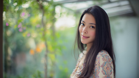A young woman with long, dark hair smiles gently at the camera. She is wearing a floral-patterned blouse and is positioned in front of a softly blurred background of greenery and flowers, suggesting an outdoor or garden setting.