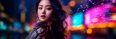 Glamor of a city night with a young Asian woman featuring voluminous curls and a makeup style that shines under city lights.Generative AI