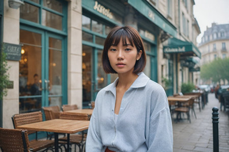 young beautiful asian woman in Paris, France, in a street cafe